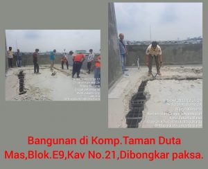 Di tempat terpisah, Rabu (5/10) Satpol PP Jakarta Barat juga melakukan pembongkaran paksa terhadap bangunan Rumah Tinggal setinggi 4 ½ lapis di Komplek Perum Taman Duta Mas, Blok. E9, Kav No.21, RT.06/RW.09, Kelurahan Wijaya Kusuma, Kecamatan Grogol Petamburan. Bangunan yang pengerjaanya sudah mencapai 75 % itu hanya mengantongi IMB 3 lapis.